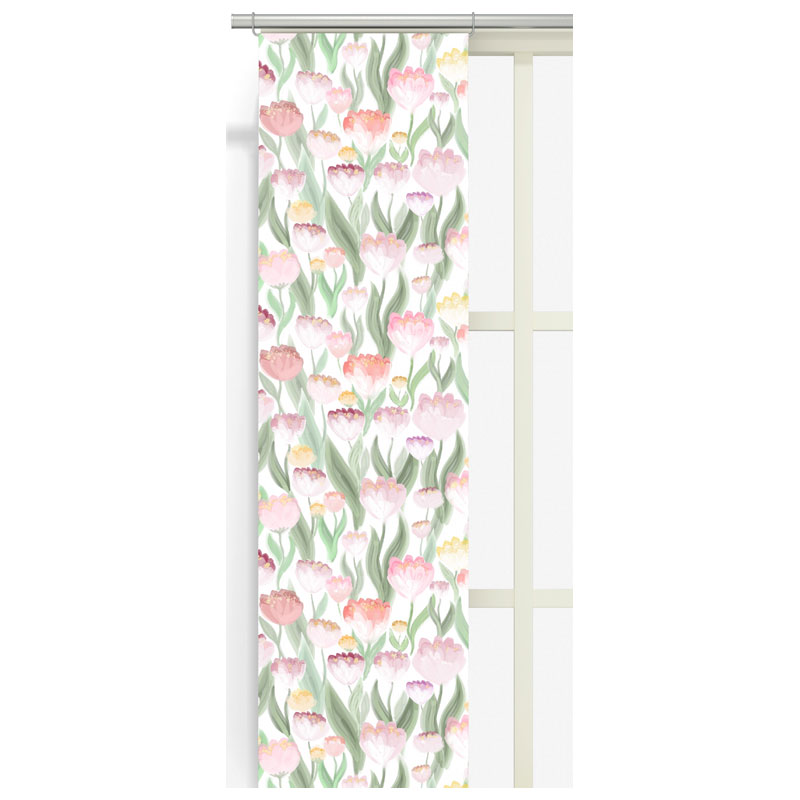 Charmiga panelgardiner från Arvidssons textil med ett ljuvligt blommönster i nyanser av rosa, orange och grönt mot en vit botten.