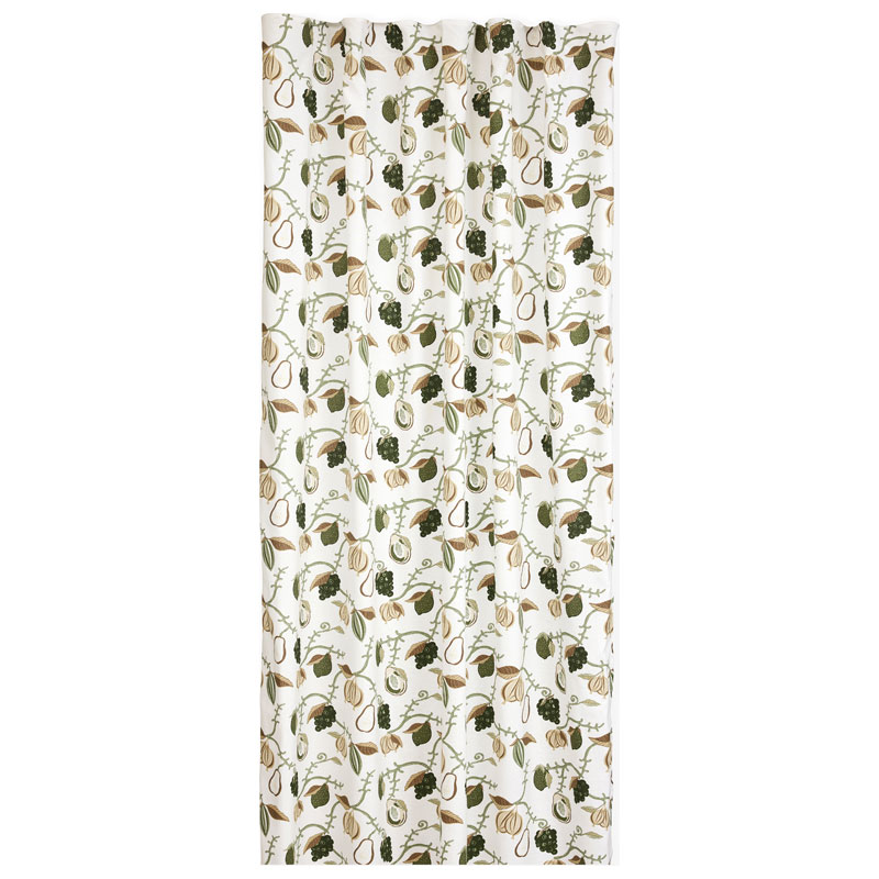 Melora från Jakobsdals, ljusa gardiner prydda med ett slingrande mönster av blad, frukter och rankor i grönt, beige och brunt som ger en harmonisk känsla av ro samtidigt som det tillför värme och liv till rummet.