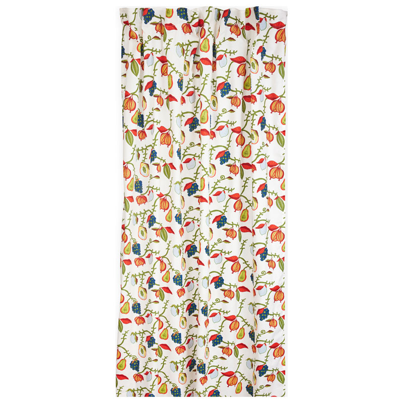 Melora från Jakobsdals, ljusa gardiner prydda med ett lekfullt mönster av slingrande rankor, frökapslar och bär i klara nyanser av rött, blått och grönt.