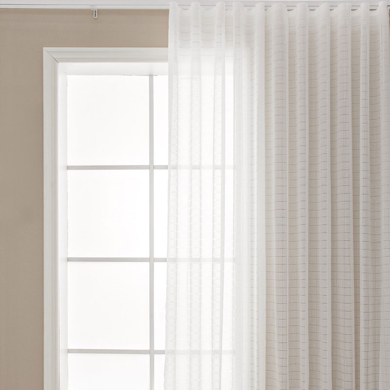 Vacker skir gardinlängd med invävt rutmönster från Hasta Home.