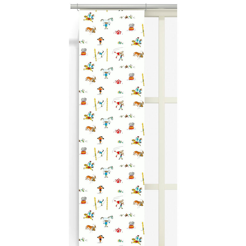 Underbara panellängder från Arvidssons Textil, med härligt mönster av olika motiv av Pippi på cirkus mot en vit botten.