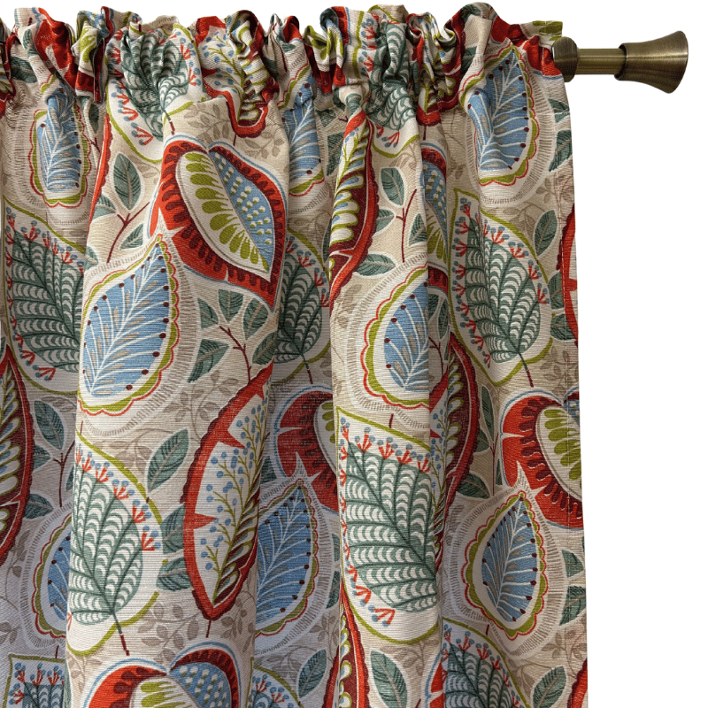 Saga, snygga gardinlängder från Ernst Textil. Fin gardin i bomull och polyester med ett vackert mönster i röda och turkosa nyanser.