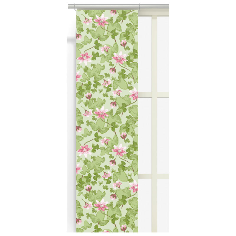 Sippa från Arvidssons Textil, gröna panelgardiner med gulligt, rosa blommönster.