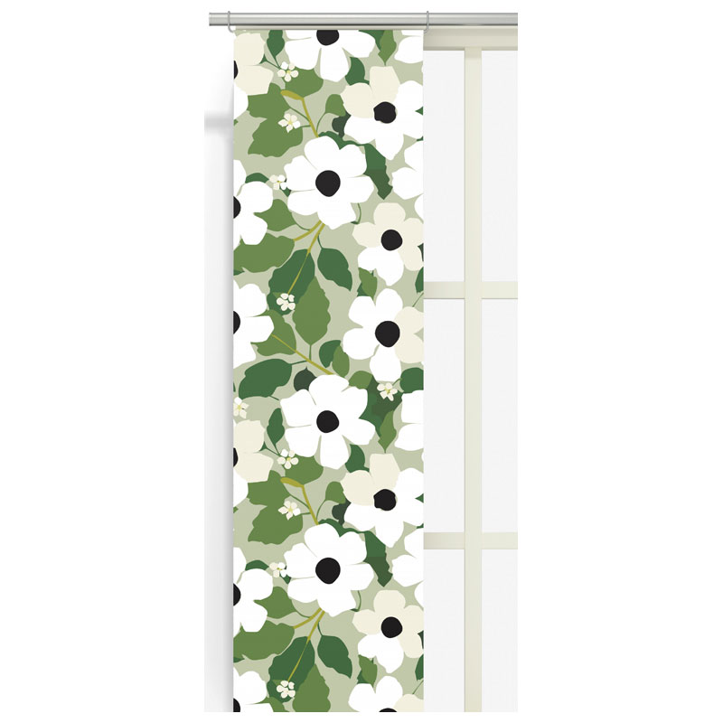 Svartöga från Arvidssons Textil, härliga panelgardiner med mönster av stora, vita blommor på en grön botten.