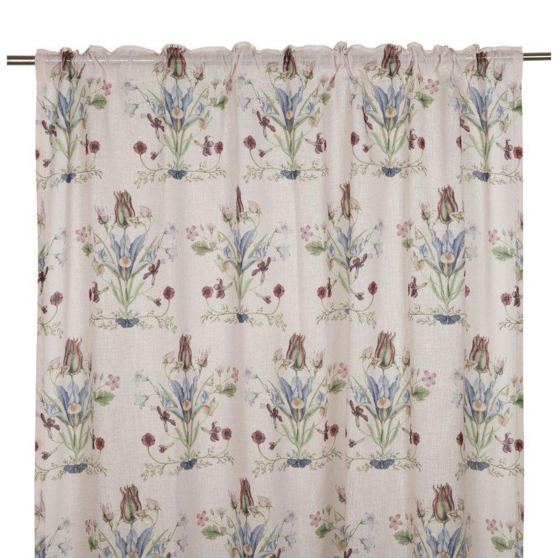 Vendela från Fondaco, skira gardinlängder med ett romantiskt, blommigt mönster på en ljusrosa bakgrund.