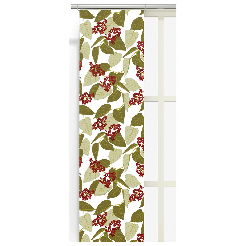 Vid fikabordet panelgardin från Arvidssons Textil. Vackra panelgardiner med motiv av röda fläderblommor och gröna blad på en ljus bakgrund.