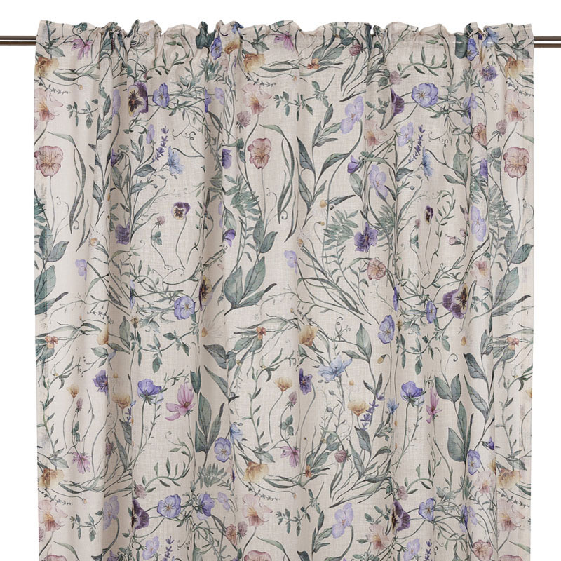 Viola från Fondaco, skira gardinlängder med ett ljuvligt, blommigt mönster på en sandfärgad bakgrund.