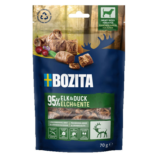 Bozita Meaty Bites - ett spannmålsfritt premiumgodis med 95% älg och anka, berikat med lingon, mynta och lavendel. Ett läckert hundgodis, med naturliga ingredienser, hög kötthalt och gjorda av det finaste utvalda köttet.