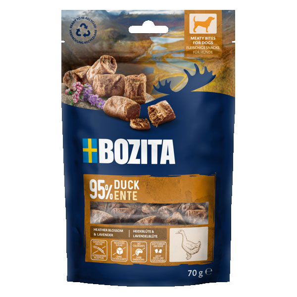 Bozita Meaty Bites - ett spannmålsfritt premiumgodis med 95% anka, smaksatt med ljung och lavendel. En förfinad och naturlig godsak med rik smakprofil. Ett läckert hundgodis, med naturliga ingredienser och gjorda av det finaste utvalda köttet.