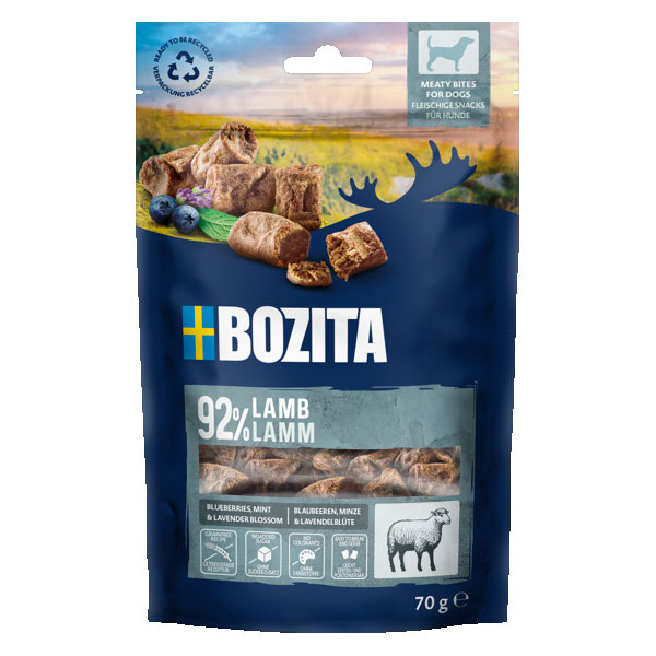 Bozita Meaty Bites - ett spannmålsfritt premiumgodis med 92% lamm, kompletterat med blåbär, mynta och lavendel. Ett läckert hundgodis, med naturliga ingredienser och gjorda av det finaste utvalda köttet. En utsökt, naturlig och aromatisk godsak.