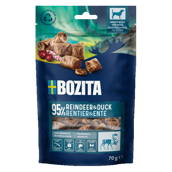 Bozita Meaty Bites - ett spannmålsfritt premiumgodis med 95% ren och anka, förfinat med en touch av lingon och ljung. Perfekt och naturlig godsak med smaker från den nordiska vildmarken. Ett läckert hundgodis, med naturliga ingredienser och gjorda av det finaste utvalda köttet.