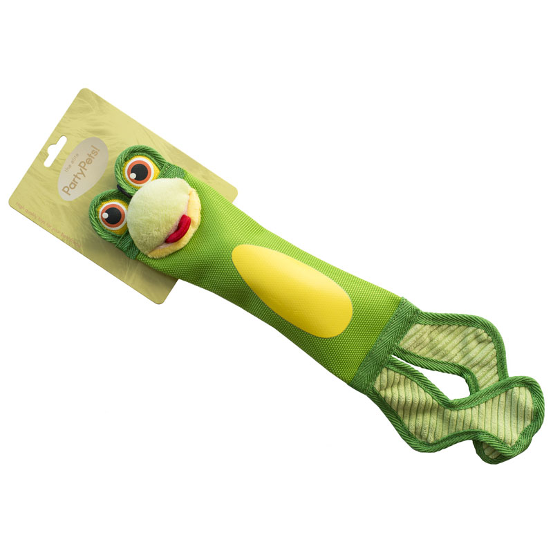 Exklusiv hundleksak från Party Pets premiumsegment Elite i form av en grön groda tillverkad i extra tåligt brandslangs-material.