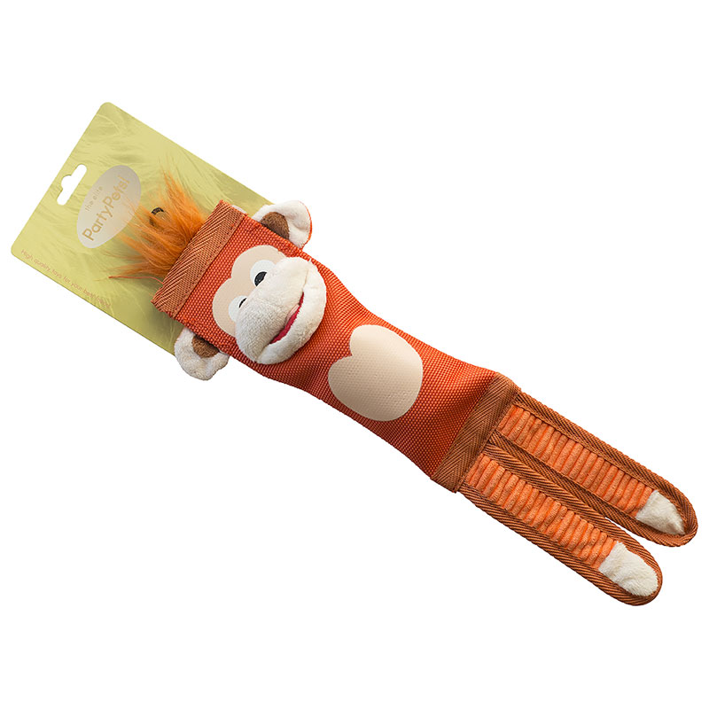 Exklusiv hundleksak från Party Pets premiumsegment Elite i form av en orange apa tillverkad i extra tåligt brandslangs-material.