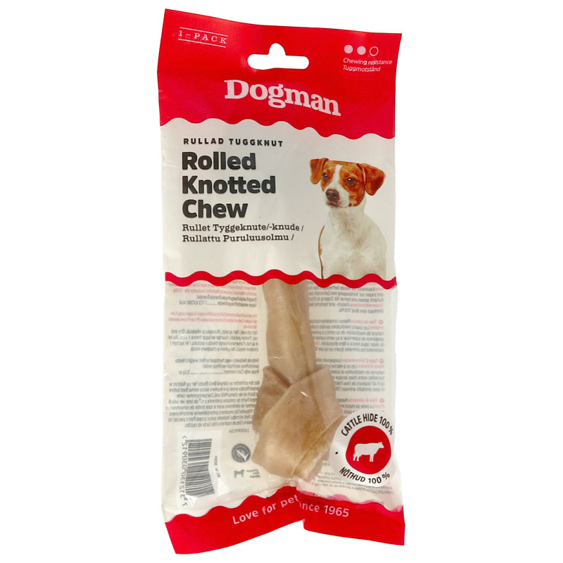 Naturlig tuggknut av högkvalitativ, obehandlad och rullad råhud. Förlänger tuggtiden, tillgodoser tuggbehovet och bidrar till en sund tandhälsa.