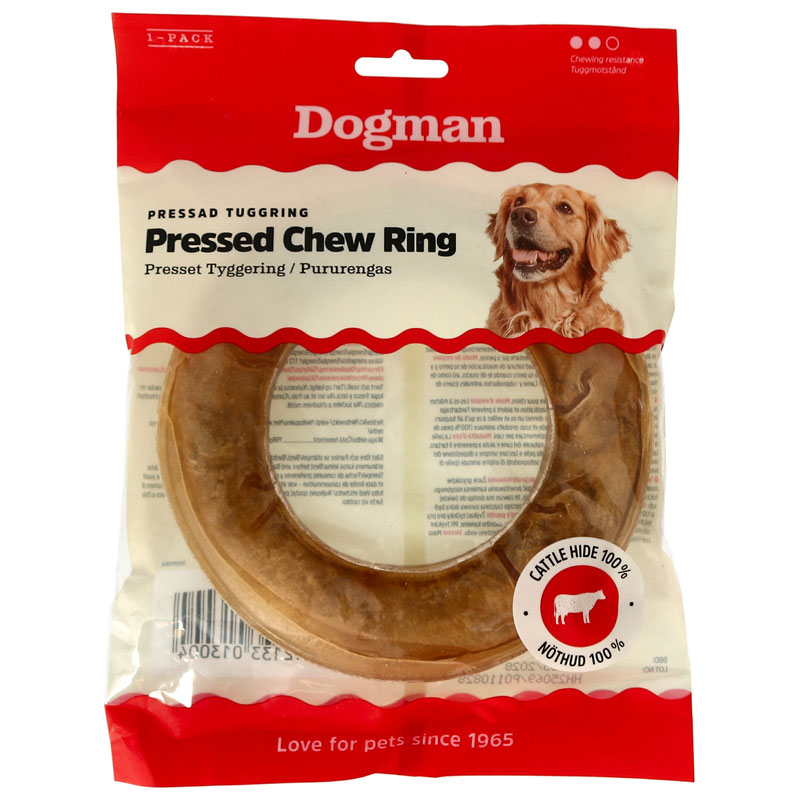 Naturlig tuggring av högkvalitativ, obehandlad och pressad råhud. Förlänger tuggtiden, tillgodoser tuggbehovet och bidrar till en sund tandhälsa.