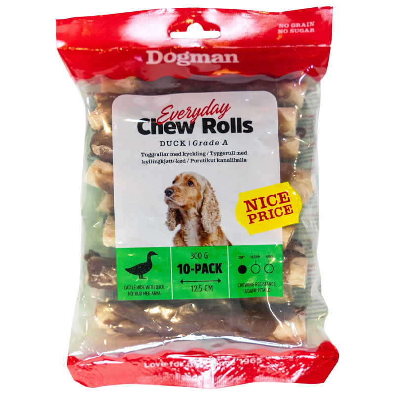 Tuggrullar med smaskig anka från Dogman. Lätta att tugga och passar därför perfekt till hundar som behöver mindre tuggmotstånd. Ger sysselsättning och tillgodoser tuggbehovet.