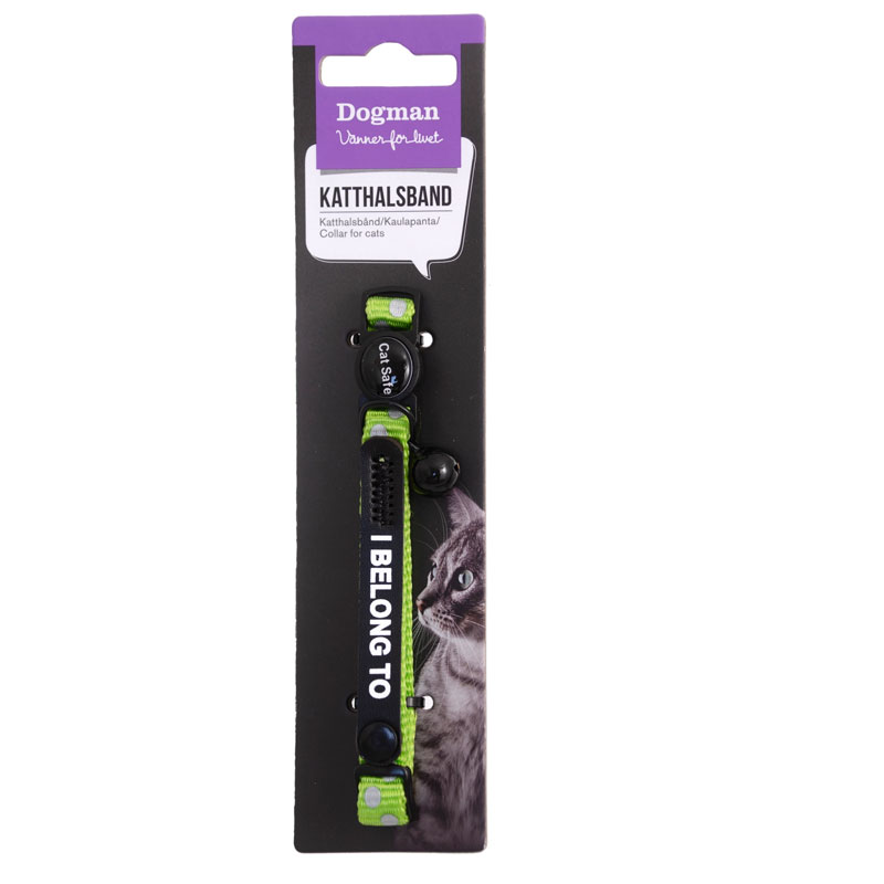 Reflekterande katthalsband med Cate safe säkerhetslås som öppnar sig om din katt skulle fastna med halsbandet i någonting. Bjällra för att skydda småfåglarna och justerbar längd max 30cm.