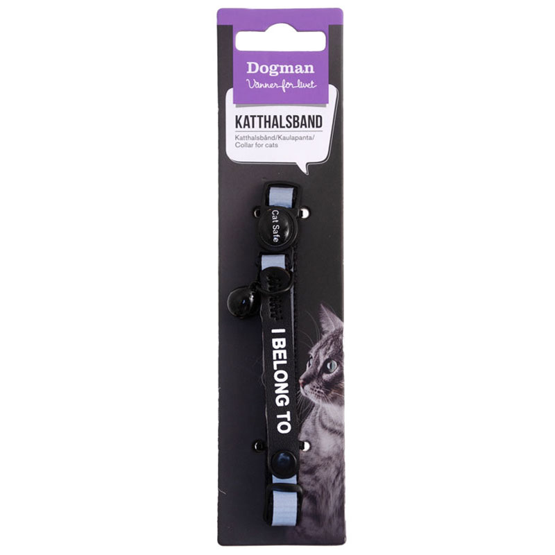Reflekterande katthalsband från Dogman med Cate safe säkerhetslås som öppnar sig om din katt skulle fastna med halsbandet i någonting. Bjällra för att skydda småfåglarna och justerbar längd max 30cm. "I belong to" funktion där du kan ange telefonnummer.