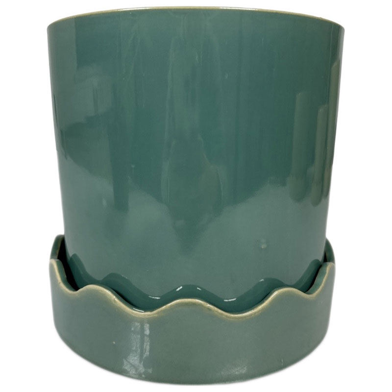 Snygg stilren kruka med glaserad yta och fat med trendig vågig kant.