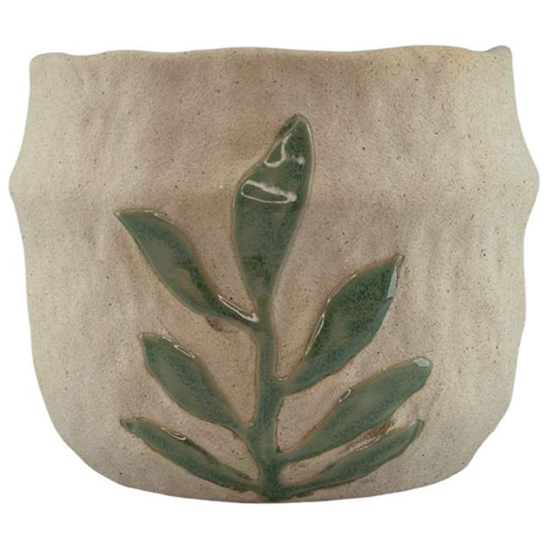 Tjusig kruka tillverkad i stengods, från Miljögården. Med ett fint och läckert, handmålat mönster av en bladstjälk.