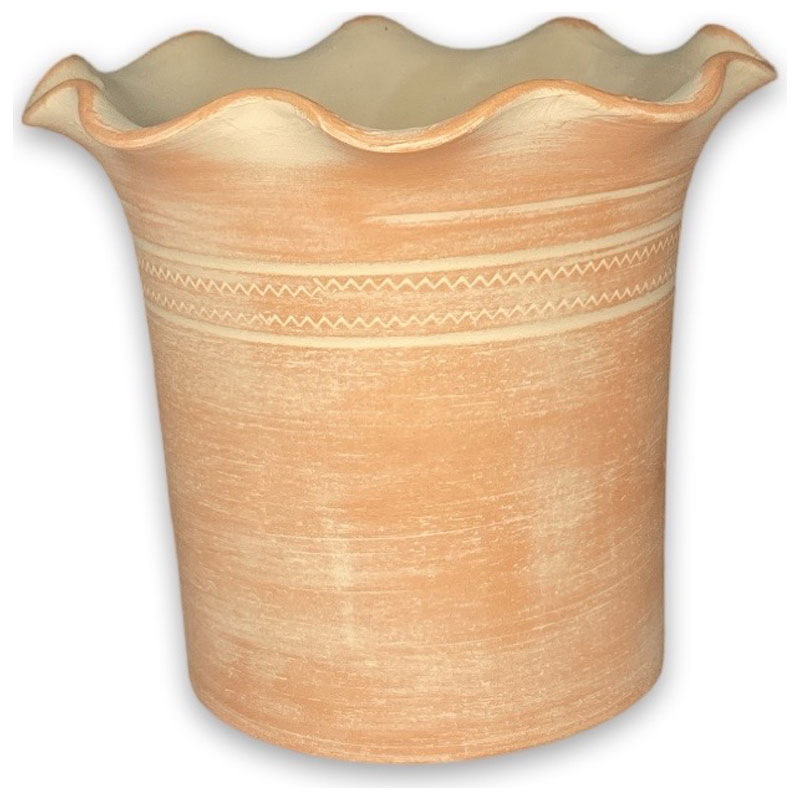 Snygg kruka i terrakottafärgad keramik med vågad kant från Miljögården.