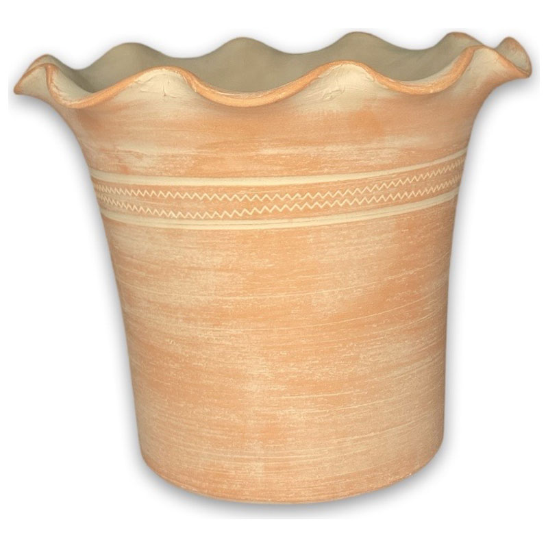 Snygg kruka i terrakottafärgad keramik med vågad kant från Miljögården.