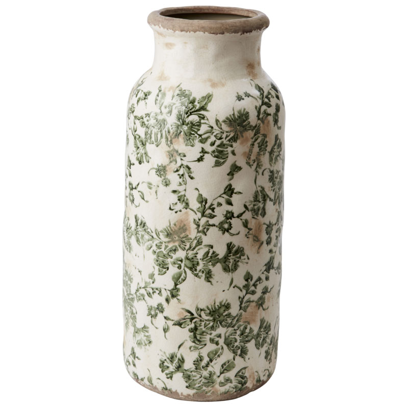 Victoria från Affari of Sweden, vacker rustik stengods urna med gröna blomster rankor på.