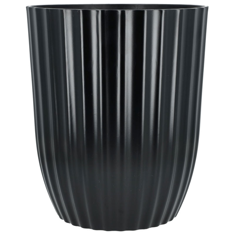 Charmig kruka med en vågig design i svart, tillverkad av återvunnen plast.