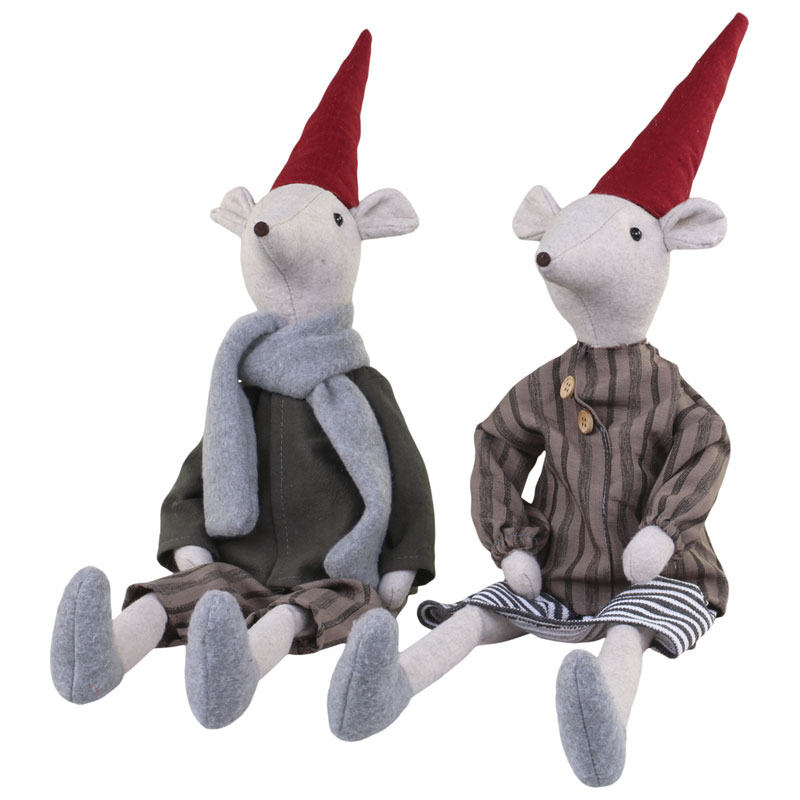 Gulligt 2-set julmöss från Chic Antique, iklädda små randiga plagg, med grå skor och en röd mössa.