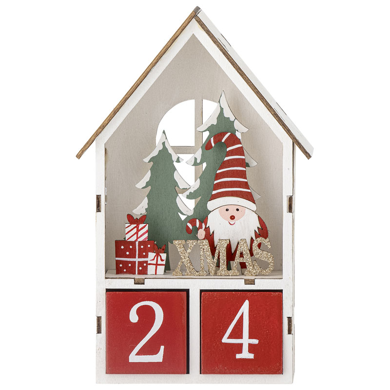 Kalendern förställer ett litet hus prydd av en tomte, paket, granar och texten "xman" i guldigt trä.