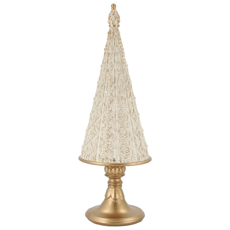 Vacker julgran från Chic Antique, med en vit botten och detaljer i guld.