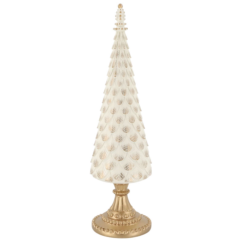 Vacker julgran från Chic Antique, med en vit botten och detaljer i guld.