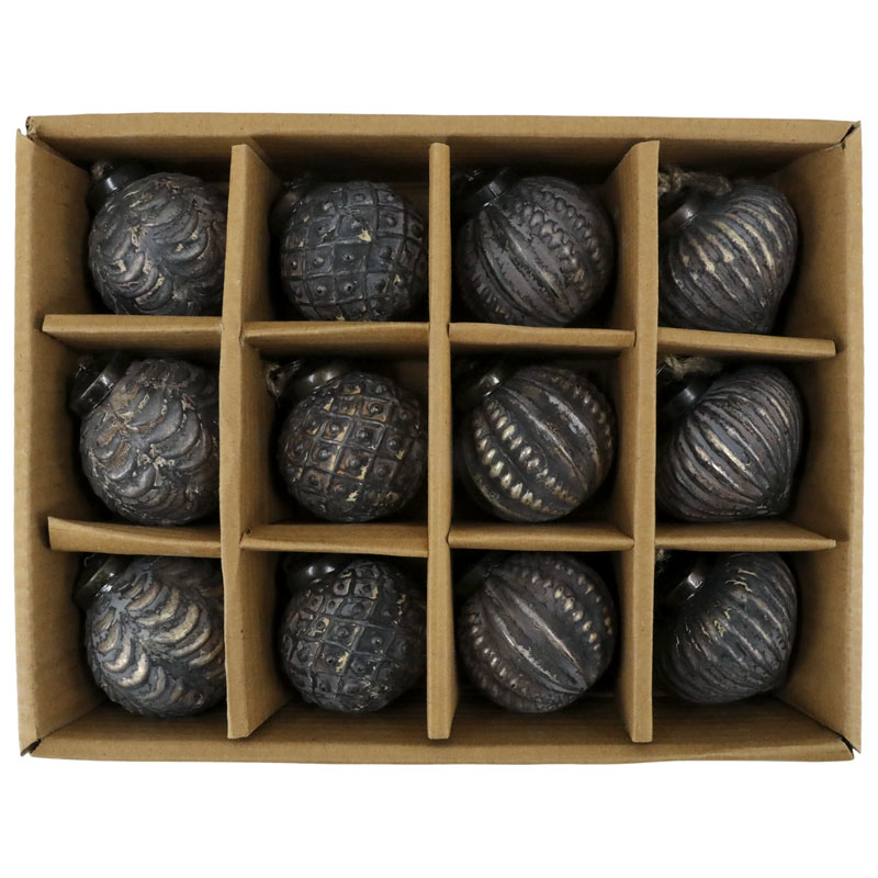 Härligt 12-set med julkulor från Chic Antique, med fyra olika mönster i en härlig nyans av antik mocca.