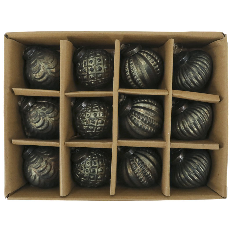 Härligt 12-set med julkulor från Chic Antique, med fyra olika mönster i en härlig nyans av antik olivgrön.