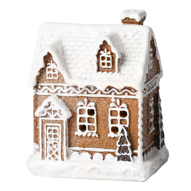 Prydnadshus Pepparkaka från East Import är en charmig dekoration utformad som ett litet pepparkakshus täckt av vit snö.