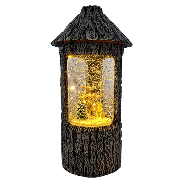 Julmotivet är omringat av vatten med glitter som snurrar när man kopplar in den