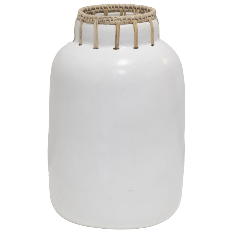 Elegant terrakottavas från Halvor Bakke som kombinerar naturliga material med tidlös design. Vasen har en matt, vitlaserad yta i terrakotta och vackra rottingdetaljer på den övre delen.