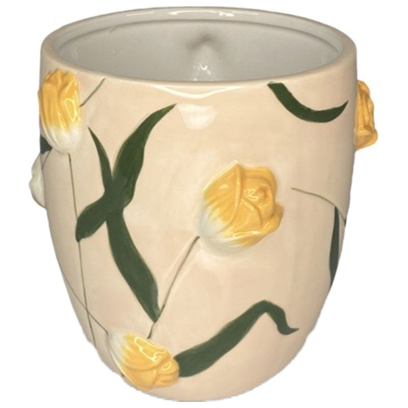 Vacker handmålad kruka dekorerad med gula vilda tulpaner.