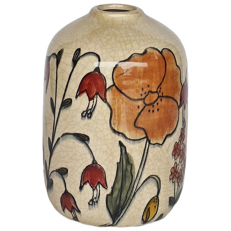 Romantiskt vas från Miljögården tillverkad av stengods, prydd av ett handmålad blommönster mot en naturfärgad botten.