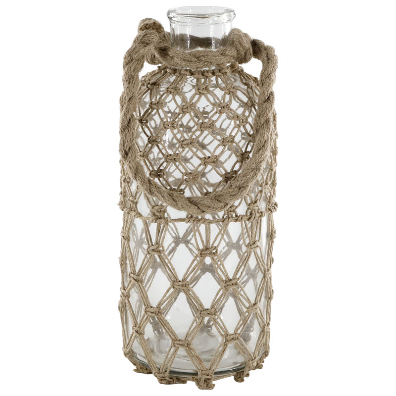 Snygg marin inredningsdetalj i form av en flaska klädd med flätad jute.