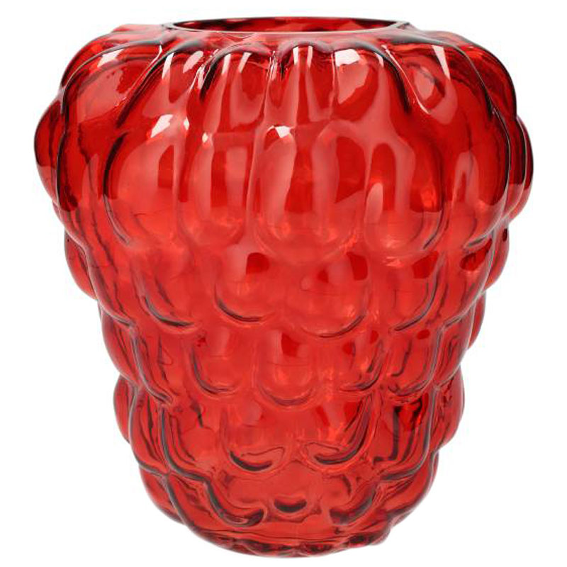 Inred rummet med en stor bukett blommor i denna hallonformade vas.