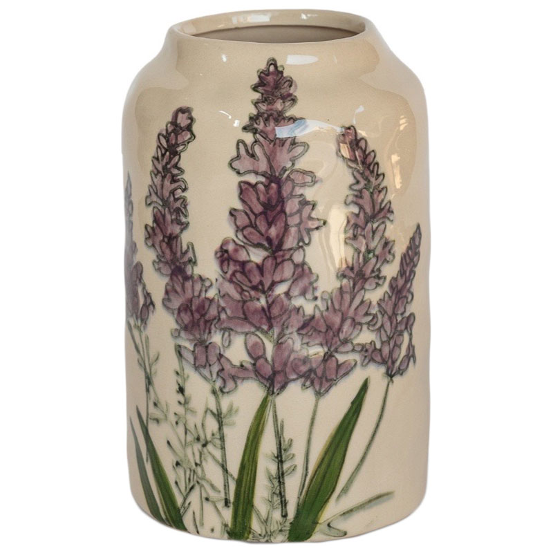 Prydd av ett vacker handmålat lavendelmönster mot en naturfärgad botten.