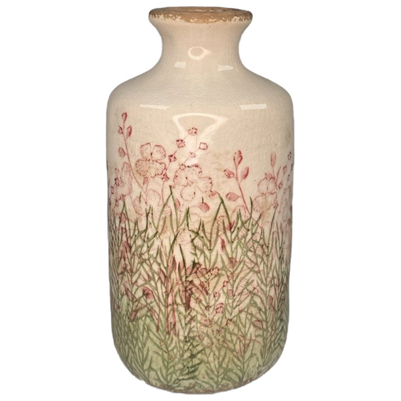 Silene är en vacker vas från Miljögården tillverkad av keramik, prydd av rosa blommor med stjälkar mot en naturvit botten.