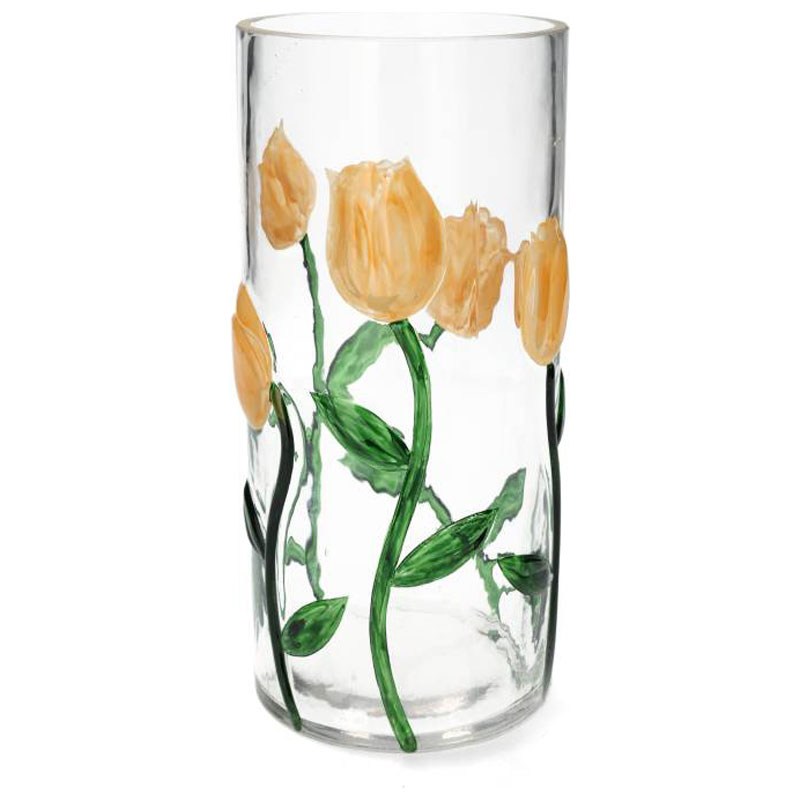 Tjusig och dekorativ vas från A Lot Decoration. En mjukt formad vas i klarglas med målade tulpaner i en varm aprikosfärgad ton. Ger ett levande och romantiskt uttryck.