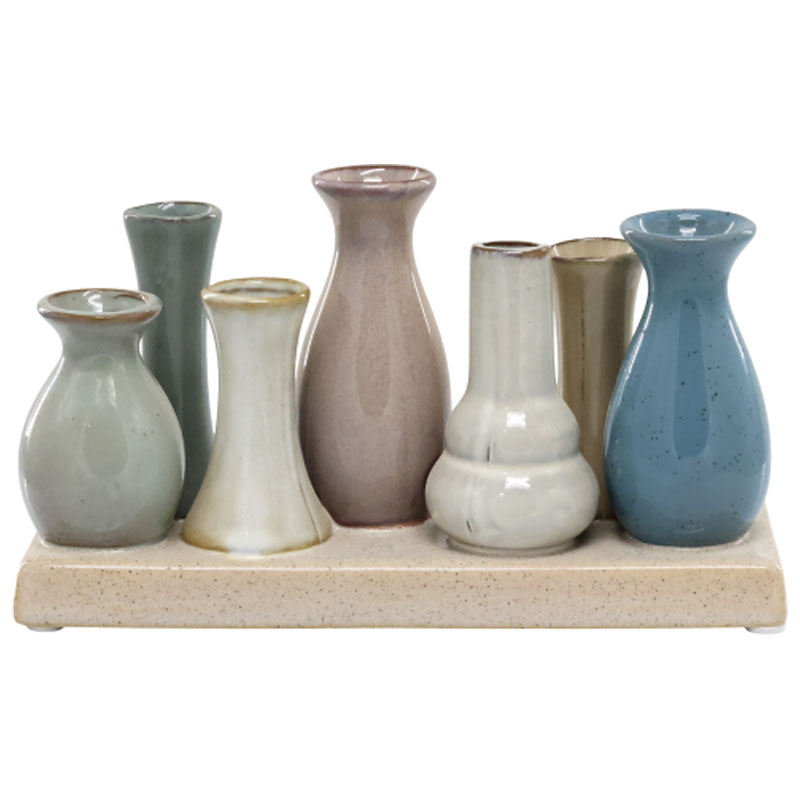 Härligt dekorationsfat prydd av sju vaser i olika former och färger som sitter fast på fatet.