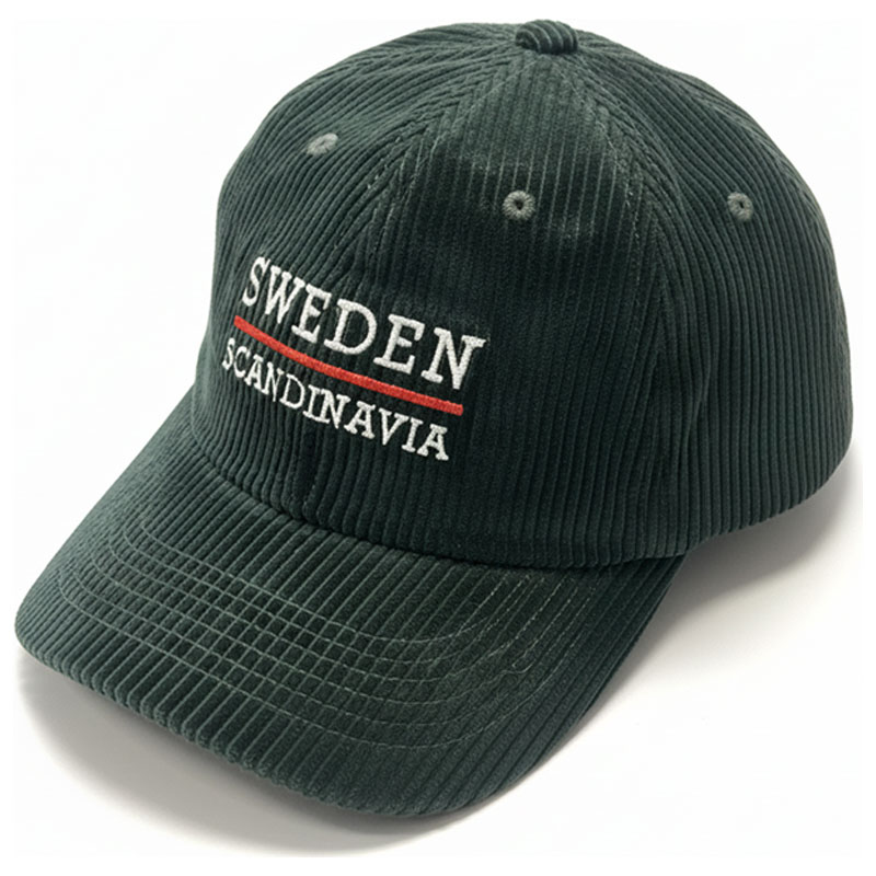 Snygg keps från Nordic Souvenir, med grönt manchestertyg och texten "Sweden, Scandinavia" broderat i vitt.