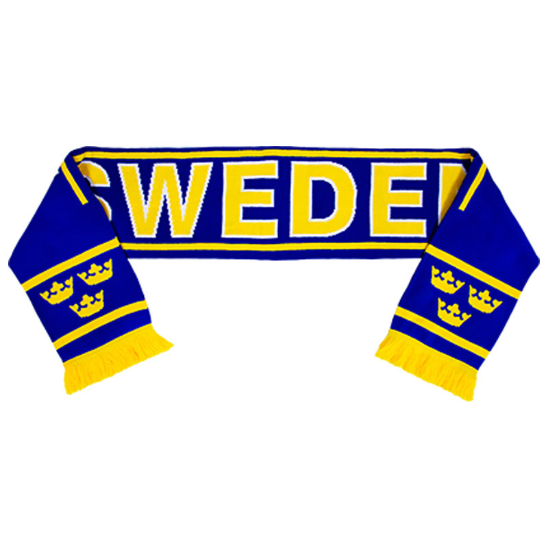 Härlig supporterhalsduk från Nordic Souvenir, med texten "SWEDEN" i gult mot en mörkblå botten.