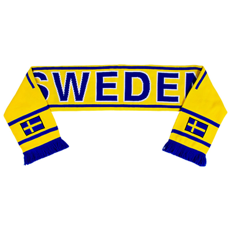 Härlig supporterhalsduk från Nordic Souvenir, med texten "SWEDEN" i blått mot en gul botten.