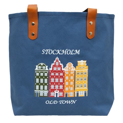 Fin blå tygväska med tryck av Gamla stan, Stockholm, Från Nordic Souvenir. Handtag av bruna läderremmar.
