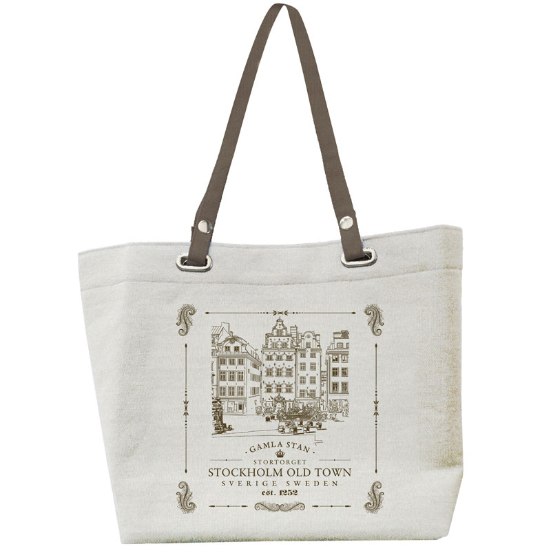 Stilren tygväska, offwhite med tryck av Gamla stan, Stockholm från Nordic Souvenir. Med bälg som ger ett större och flexibel utrymme.